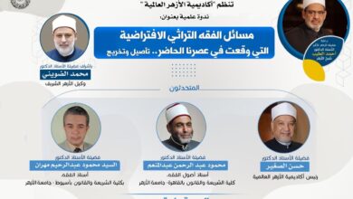 - أكاديمية الأزهر العالمية” تنظم ندوة علمية حول “مسائل الفقه التراثي الافتراضية التي وقعت في عصرنا الحاضر.. تأصيل وتخريج”