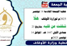 خطبة الجمعة القادمة بعنوان : من أبواب الرزق الخفية (1) صلة الرحم باب عظيم من أبواب الرزق ، لـ صوت الدعاة، بتاريخ 20 محرم 1445هـ ، الموافق 26 يوليو 2024م.