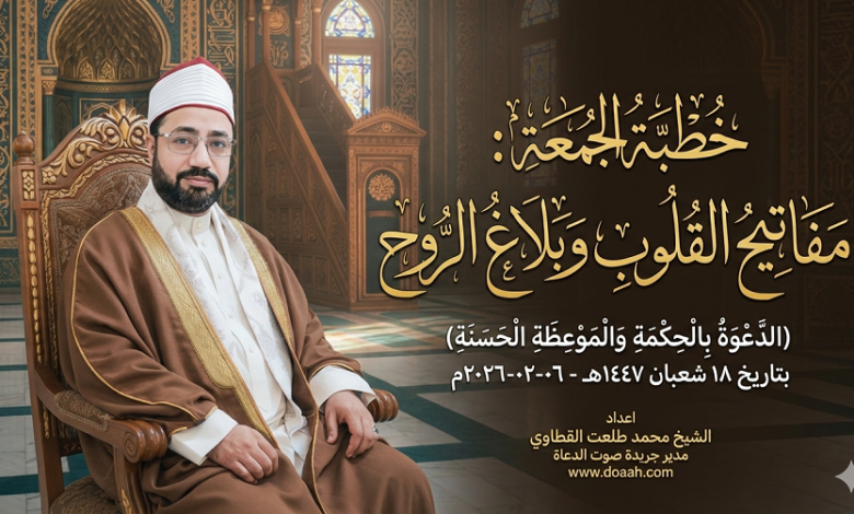 خطبة الجمعة القادمة 6 فبراير 2026 بعنوان : مَفَاتِيحُ الْقُلُوبِ وَبَلَاغُ الرُّوحِ الدَّعْوَةُ بِالْحِكْمَةِ وَالْمَوْعِظَةِ الْحَسَنَةِ الْجُمُعَةُ ١٨ شَعْبَان ١٤٤٧هـ – ٠٦-٠٢-٢٠٢٦م إعداد: الشيخ محمد طلعت القطاوى