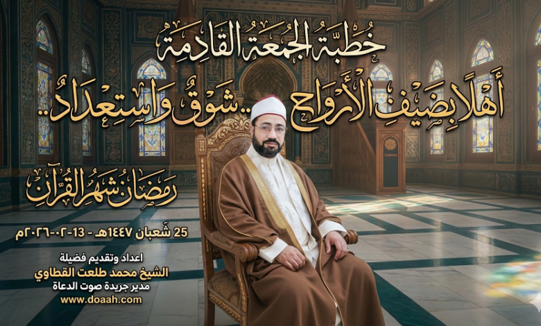 خطبة الجمعة القادمة 13 فبراير 2026 بعنوان : استقبالُ شهرِ رمضانَ ، إعداد: مدير الجريدة الشيخ محمد القطاوي لـ صوت الدعاة ، بتاريخ 25 شعبان 1447هـ ، الموافق 13 فبراير 2026م.