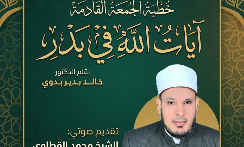خطبة الجمعة، آيات الله في بدر، الدكتور خالد بدير بدوي، الشيخ محمد القطاوي، غزوة بدر الكبرى، معجزات غزوة بدر، يوم الفرقان، دروس من السيرة النبوية، خطب مكتوبة ومسموعة، صوت الدعاة، زاد الأئمة والخطباء، النصر الإلهي.