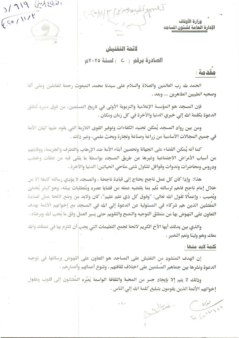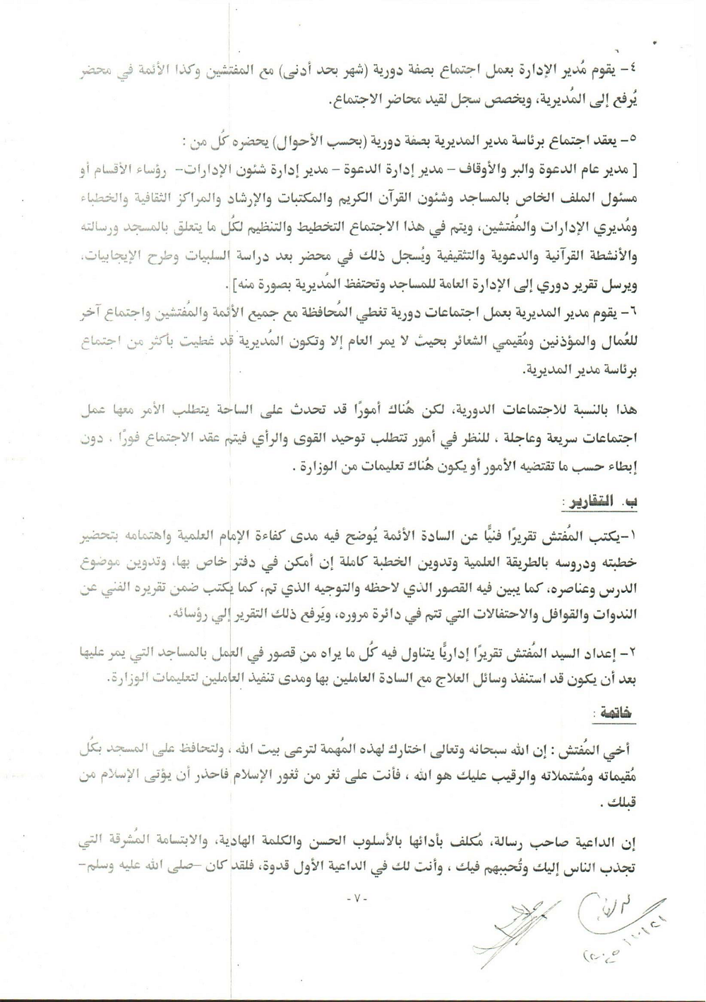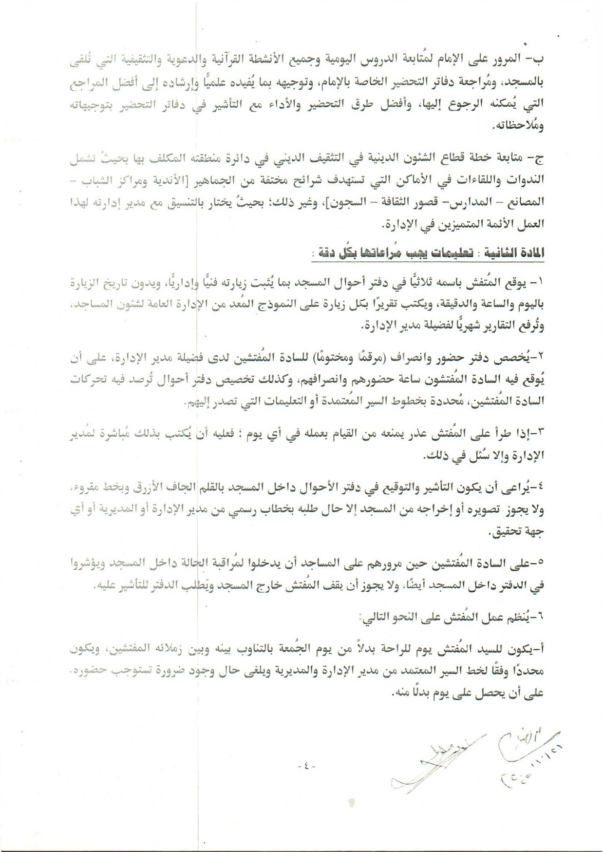 * يُوَقِّعُ الْمُفَتِّشُ بِاسْمِهِ ثُلَاثِيّاً فِي دَفْتَرِ أَحْوَالِ الْمَسْجِدِ.