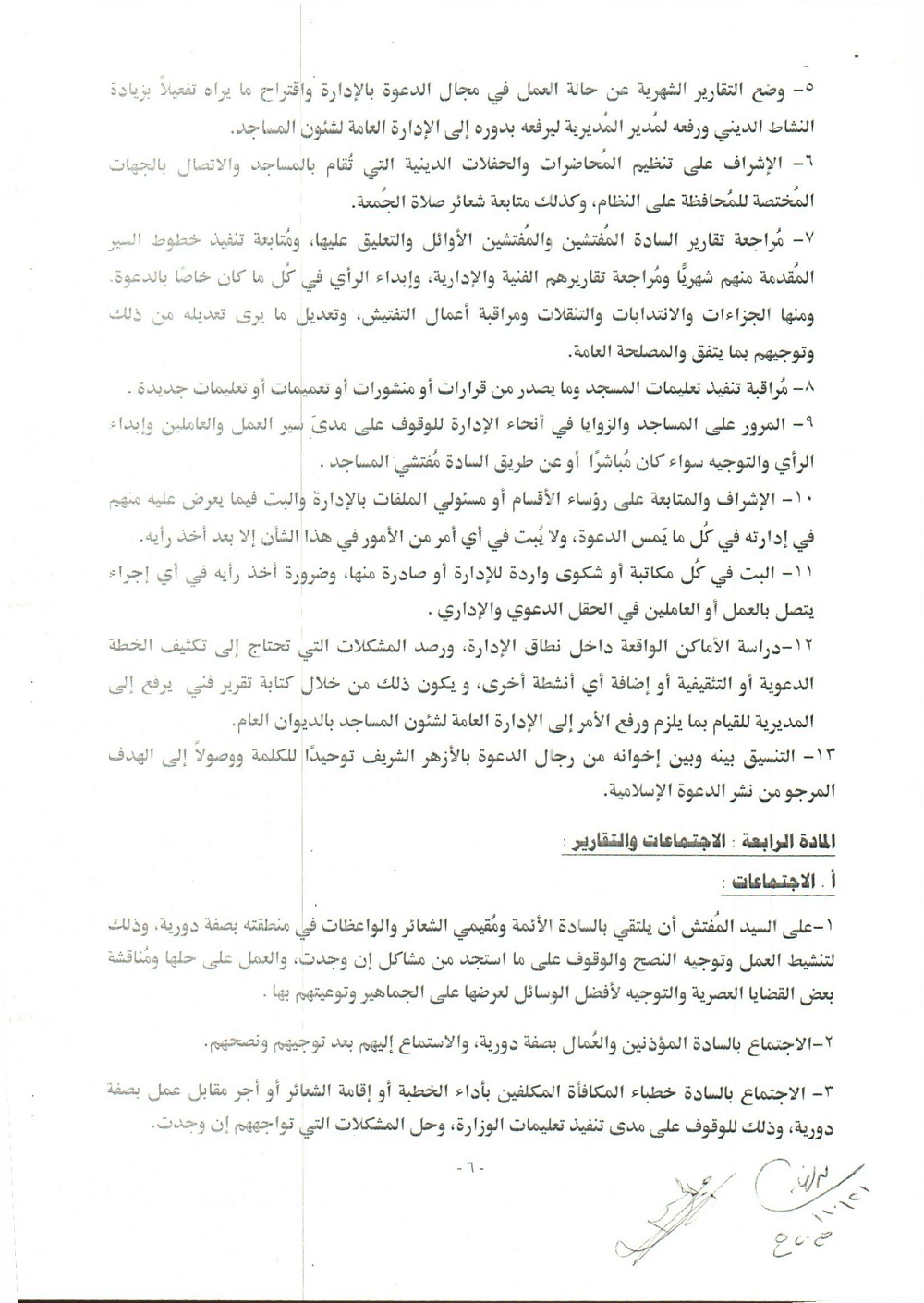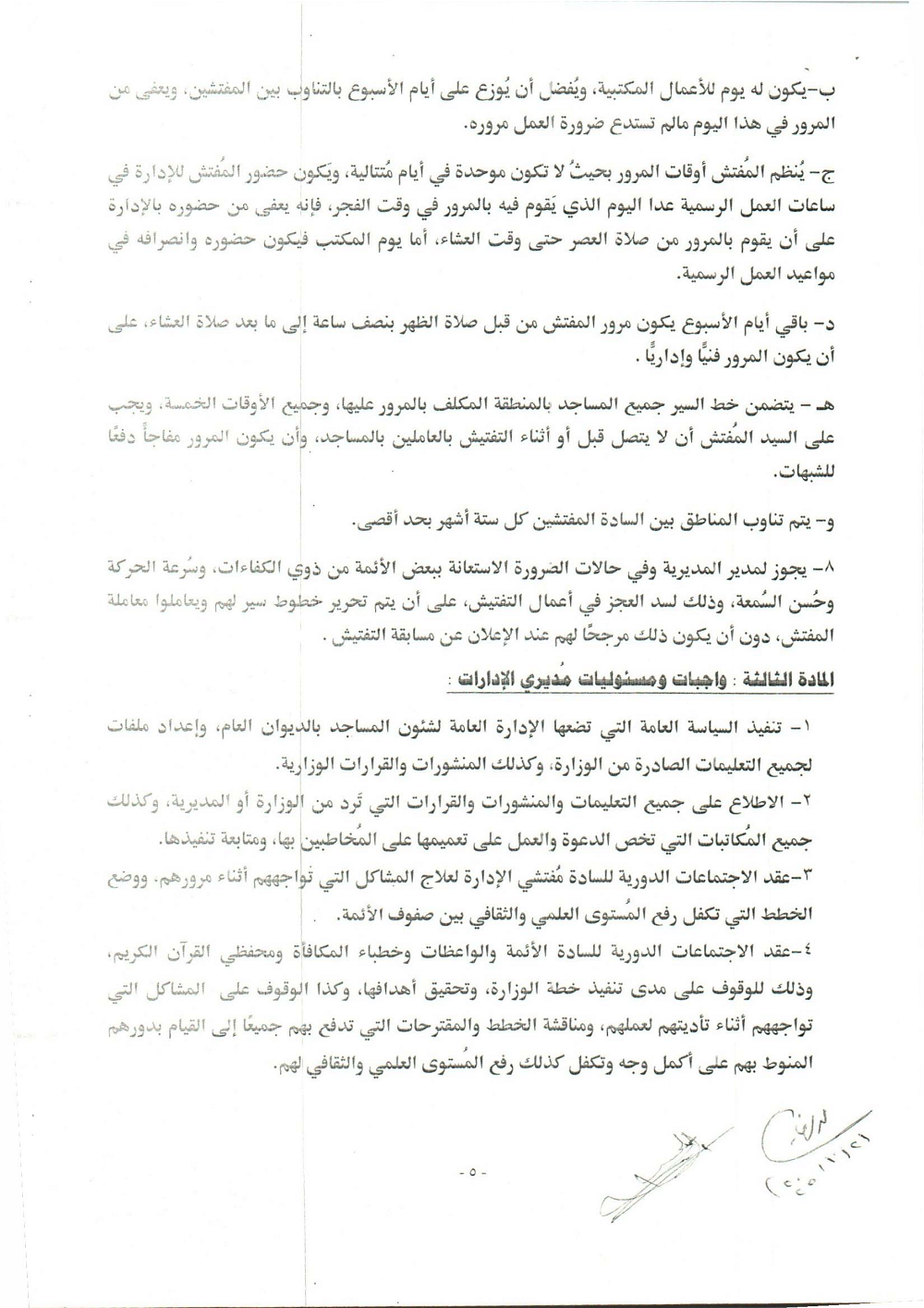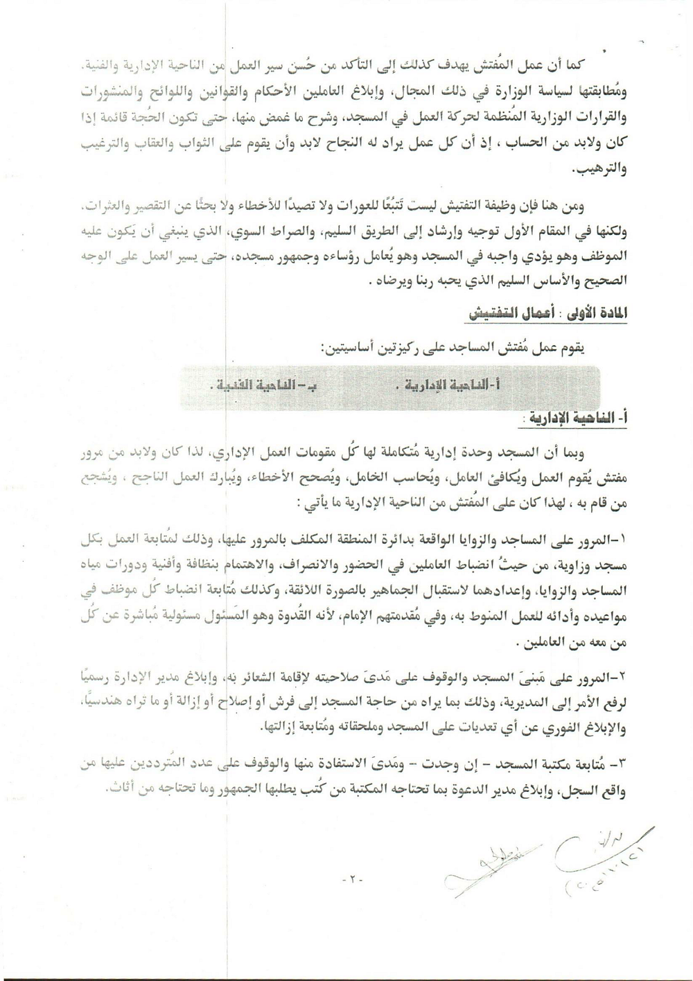 * الْمُرُورُ عَلَى الْمَسَاجِدِ وَالزَّوَايَا لِمُتَابَعَةِ انْضِبَاطِ الْعَامِلِينَ فِي الْحُضُورِ وَالِانْصِرَافِ.