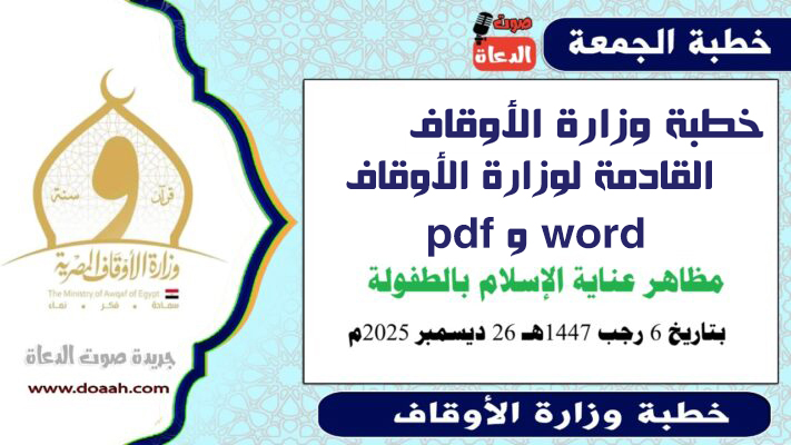 خطبة الجمعة القادمة 26 ديسمبر 2025م لوزارة الأوقاف pdf و word : مَظَاهِرُ عِنَايَةِ الْإِسْلَامِ بِالطُّفُولَةِ ، بتاريخ 6 رجب 1447 هـ ، الموافق 26 ديسمبر 2025م.