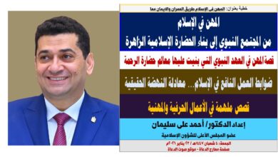 خطبة الجمعة القادمة 23 يناير 2026 بعنوان : الْمِهَنُ فِي الْإِسْلَامِ طَرِيقُ الْعُمْرَانِ وَالْإِيمَانِ معا ، إعداد: رئيس التحرير الدكتور…